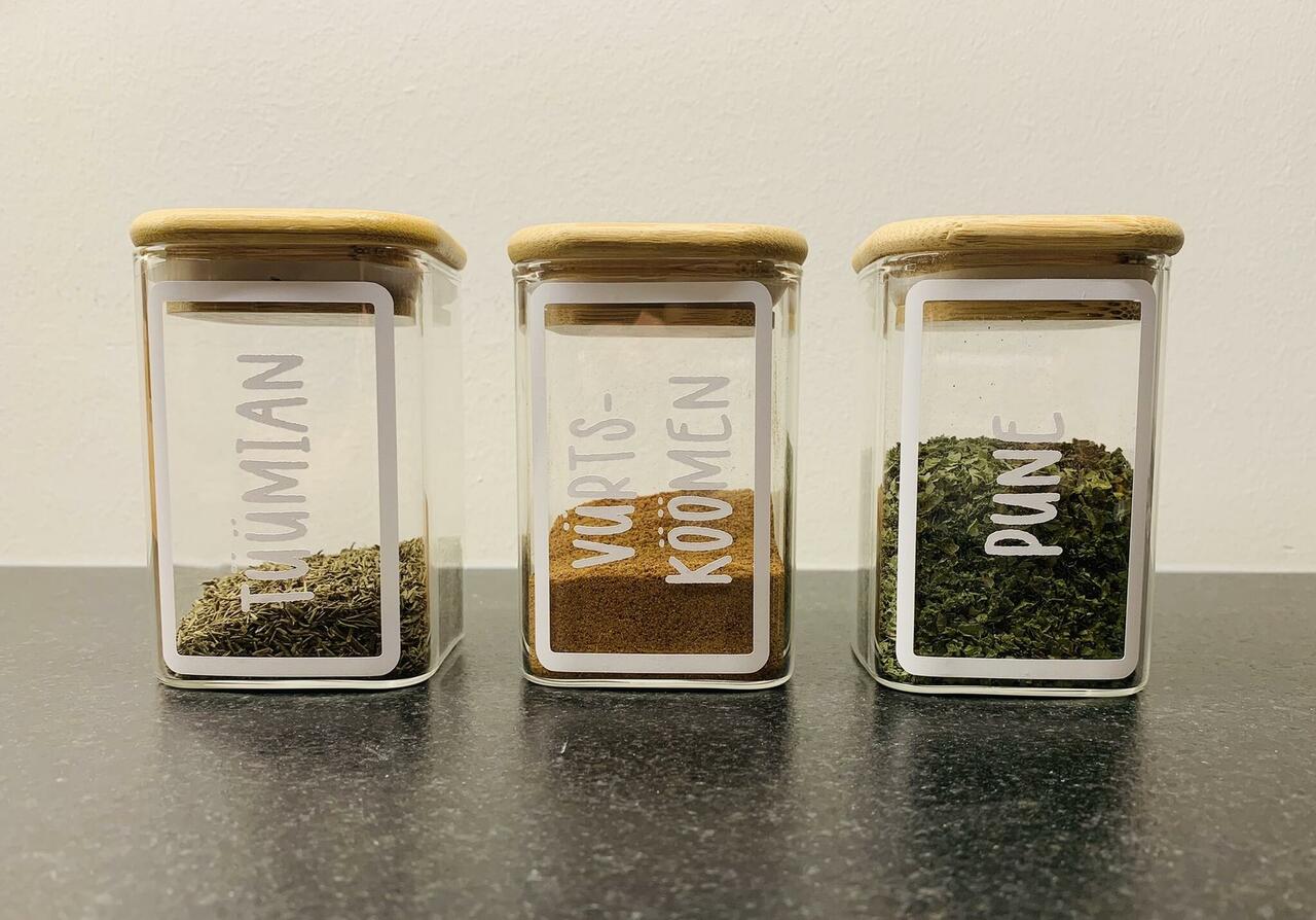 Tavalised sildid osta eraldi juurde siit ja raamiga maitseaine sildid (nagu pildil) siit.